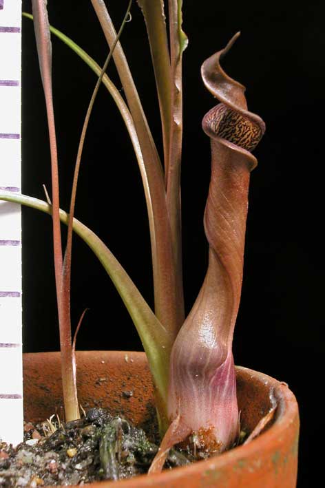 A longitudinal section of the spathe. The limb of the spathe is smooth, with the typical line pattern. The kettle has a transverse rim just over the male flowers.