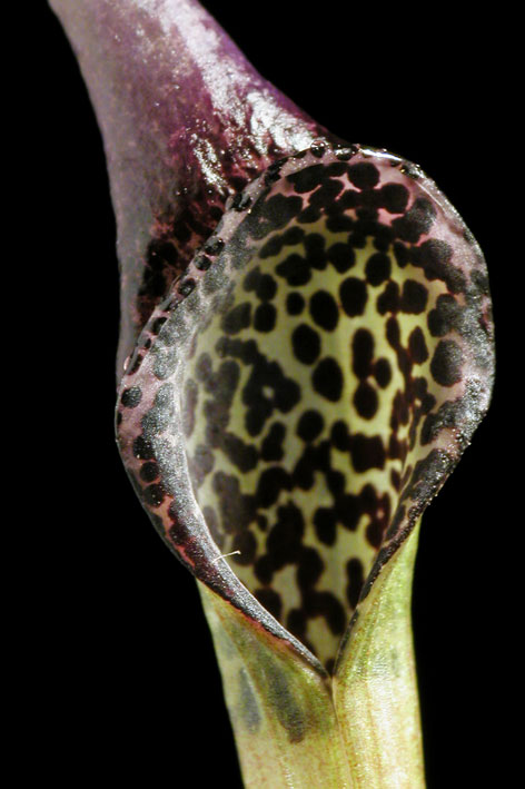 and a throat with dark violet spots. The spathe is rather elongated, and may reach more than 20 cm