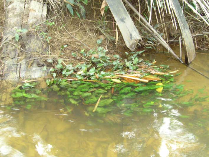 Low water in a stream in the Leuser Park in North Sumatra. Big patches of C. pontederiifolia around the trees.